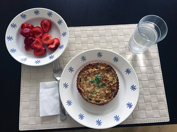 So now it’s lunchtime. The tart is fine, though I should have read the sign more carefully — or known the word for onion — because it’s a little strong, but still good, and I ate half of it. And the strawberries are as excellent as they look. The rest I’ll eat later and tomorrow, though, of course, the stands will be open then and I can go back and improve my vocabulary — and fill my refrigerator.