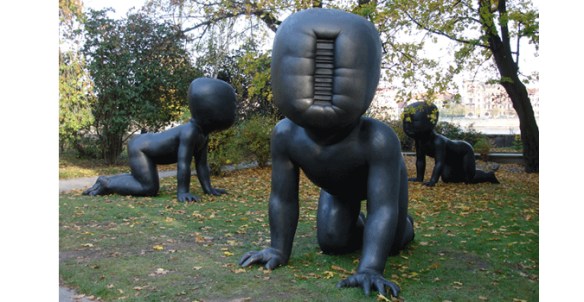 they became permanent in 2001. The 10 giant statues looked like they were crawling on hands and knees up the tower, but their cute “baby-ness” disappears if you see their faces. Like their bronze counterparts in Kampa Park, they are essentially faceless, having something like a bar code imprinted where their features should be.