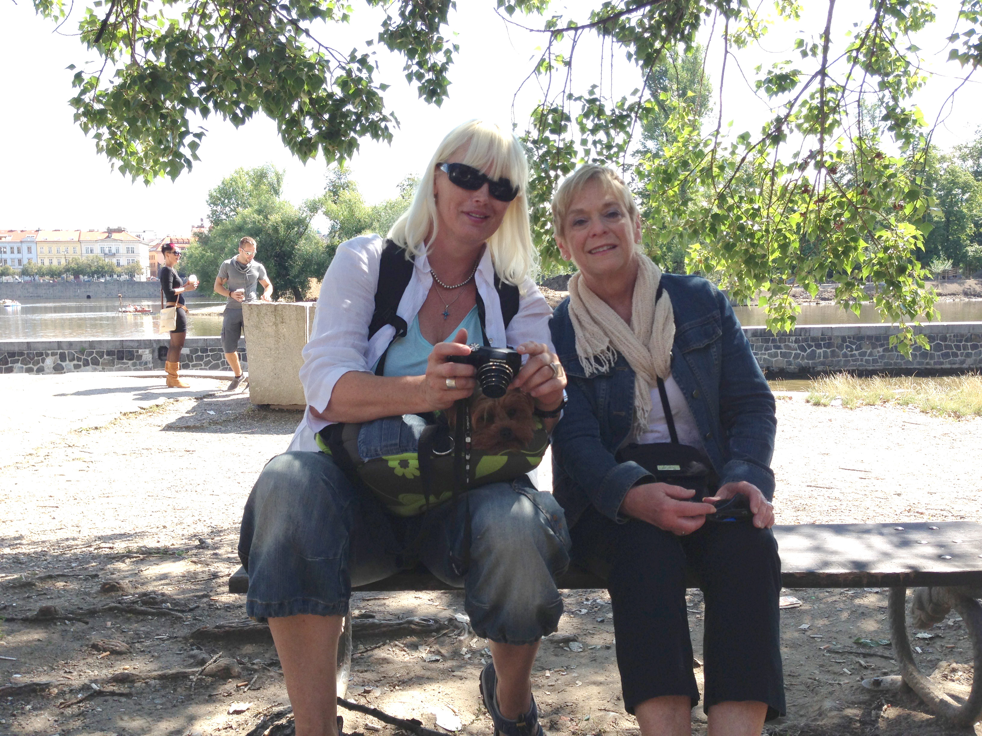 Friends since 1990, Ilja and I have some time to chat during my 2013 visit. Sára Berny — almost hidden in her bag — didn’t like me at first. (photo by Anna Hoffman)