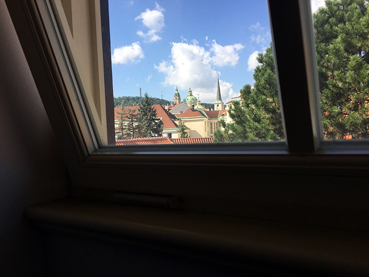 OutSunnyWindow Published October 23, 2015 at 720 × 540 in Faculty meetings and crystal chandeliers The view from my loft office space included Prague castle and more.