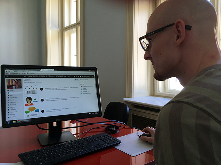 Peter Published October 23, 2015 at 720 × 540 in Faculty meetings and crystal chandeliers Peter Weis, IT specialist, demonstrates the new course content management system.