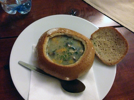 PotatoSoup Published August 13, 2013 at 432 × 324 in PotatoSoup Tucked in behind the wall of a courtyard, we found an authentic spot on a cool and rainy night, just right for vegetable soup in a rye bread bowl.